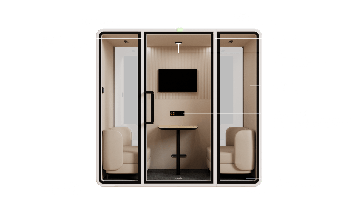 靜音艙最多的使用方式是(遠端)會議室,我們找到最理想的隔音值(降噪),由於靜音艙內聲音可獨立於艙外,成為就地隔開辦公室的最佳選擇。我們依據台灣人說話的分貝量、辦公室的白噪音、人體感覺舒適的空間音量、艙體可以隔出的舒服空間底噪及並在企業要求最好CP值條件下,設計此艙。