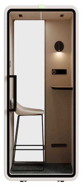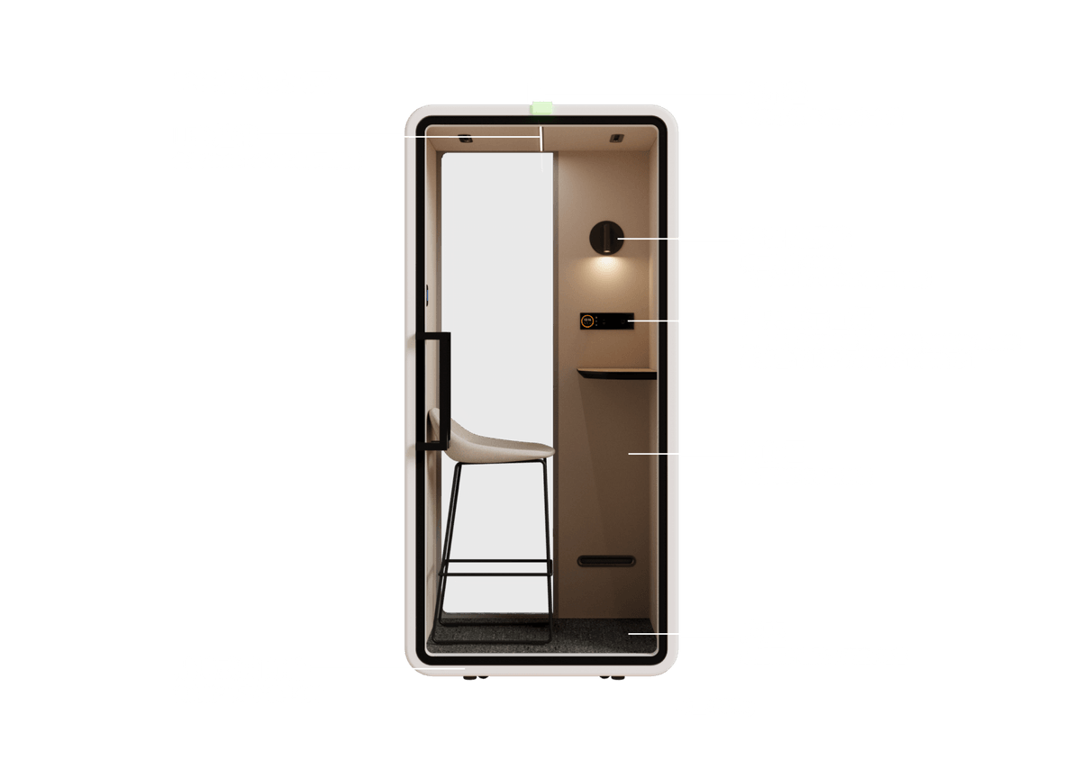 靜音艙最多的使用方式是(遠端)會議室,我們找到最理想的隔音值(降噪),由於靜音艙內聲音可獨立於艙外,成為就地隔開辦公室的最佳選擇。我們依據台灣人說話的分貝量、辦公室的白噪音、人體感覺舒適的空間音量、艙體可以隔出的舒服空間底噪及並在企業要求最好CP值條件下,設計此艙。