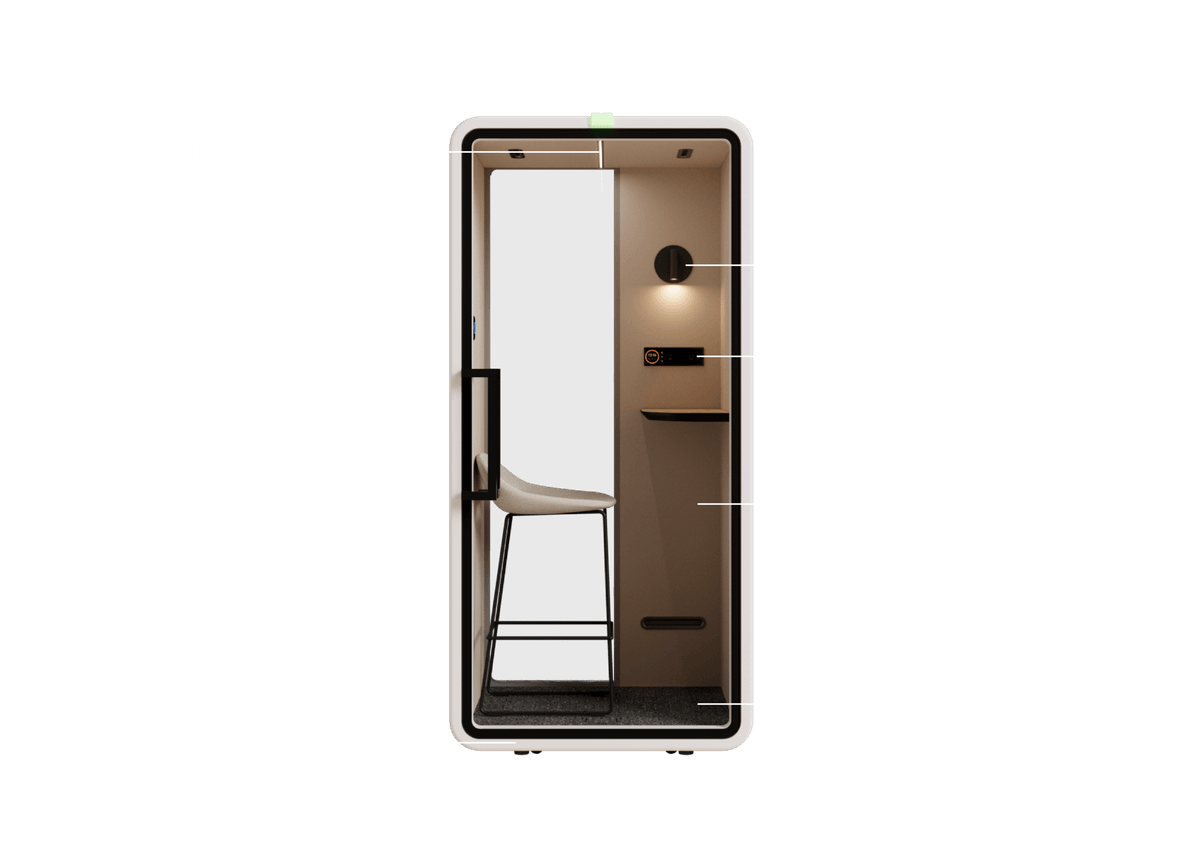 靜音艙最多的使用方式是(遠端)會議室,我們找到最理想的隔音值(降噪),由於靜音艙內聲音可獨立於艙外,成為就地隔開辦公室的最佳選擇。我們依據台灣人說話的分貝量、辦公室的白噪音、人體感覺舒適的空間音量、艙體可以隔出的舒服空間底噪及並在企業要求最好CP值條件下,設計此艙。