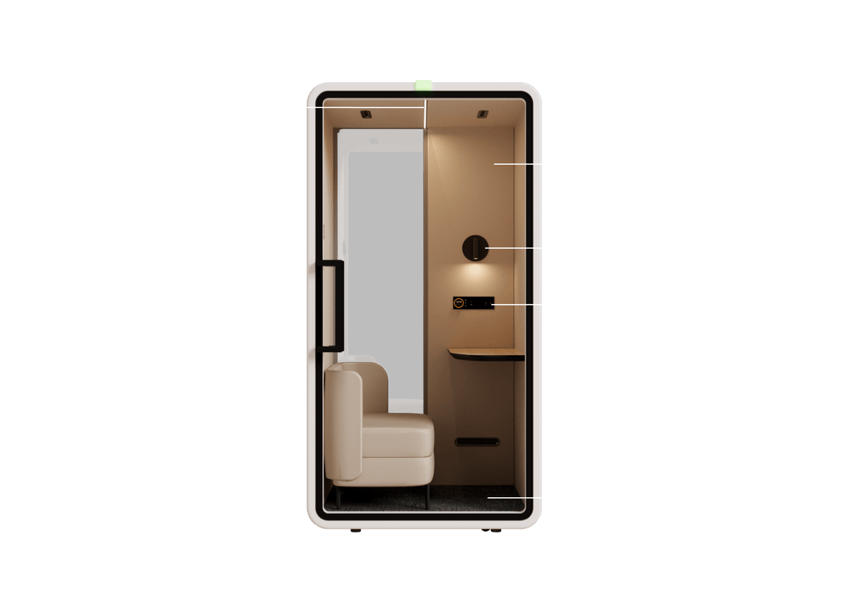 靜音艙最多的使用方式是(遠端)會議室,我們找到最理想的隔音值(降噪),由於靜音艙內聲音可獨立於艙外,成為就地隔開辦公室的最佳選擇。我們依據台灣人說話的分貝量、辦公室的白噪音、人體感覺舒適的空間音量、艙體可以隔出的舒服空間底噪及並在企業要求最好CP值條件下,設計此艙。